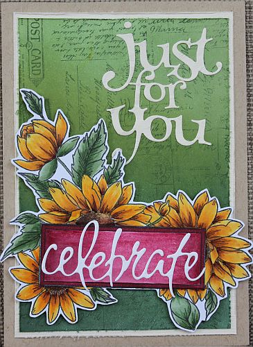 From Creampuff card, I stamped Penny Black's - Just for You and 'Celebrate' words. I adhered Just For You to the top right of the card.I then stamped the Sunflower Love on Colour Copy 200gsm card using a Memento Rich Cocoa ink pad.